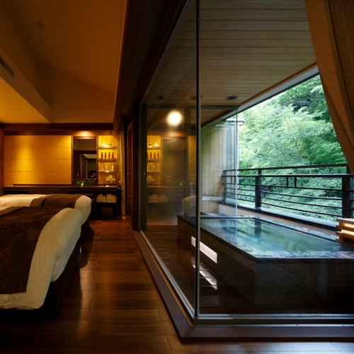「季の湯 雪月花」は、強羅駅から徒歩1分の立地でありながら、全室に客室露天風呂を備え付けた旅館になっています。